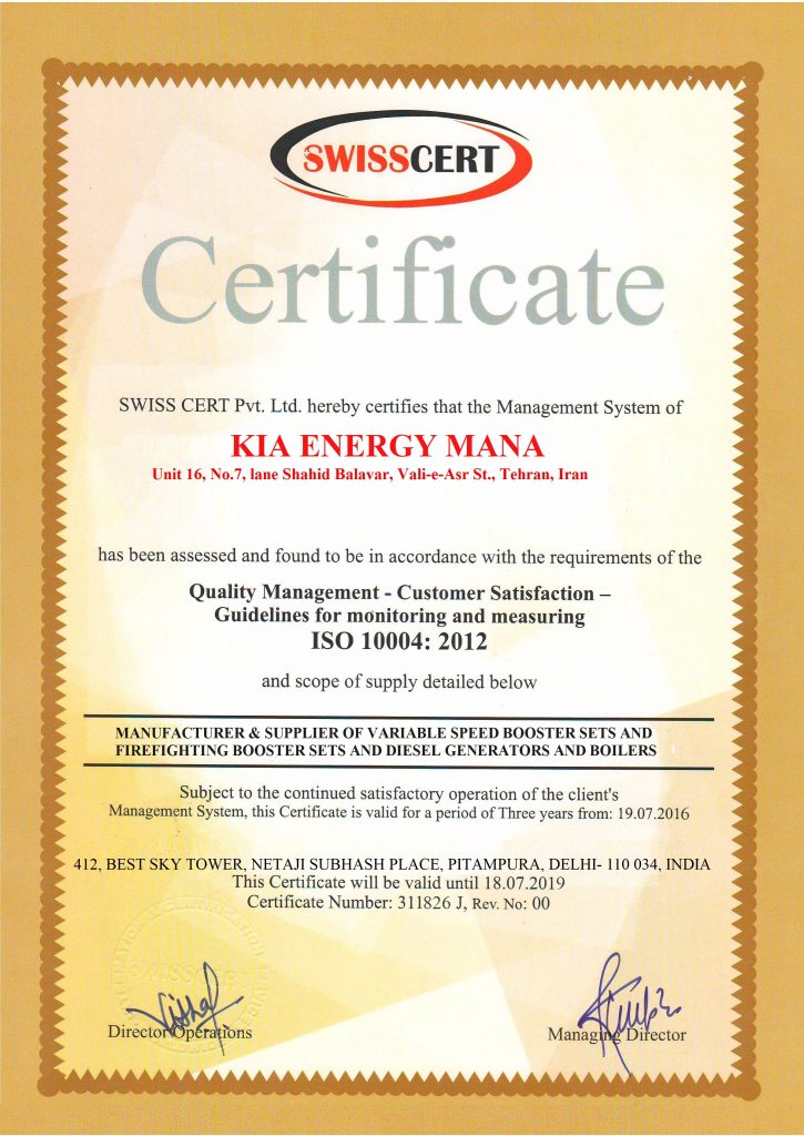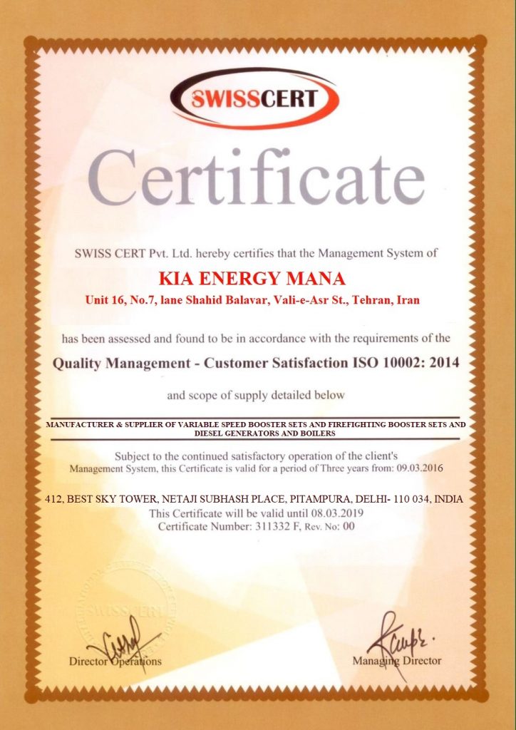 واحد فنی شرکت کیا انرژی مانا مطابق با استاندارد، جهت ارائه بوستر پمپ آبرسانی از کلکتور ورودی با سایز متناسب با ورودی و خروجی به کلکتور از جنس گالوانیزه و جهت ارائه بوستر پمپ آتش نشانی مطابق با استاندارد سازمان آتش نشانی از کلکتور ورودی با سایز حداقل 5 اینچ و کلکتور خروجیبا سایز حداقل 4 اینچ و از جنس مانیسمان استفاده مینماید. همچنین بوستر پمپ این شرکت دارای شیر فلکه و شیر صافی با برند سیم ایتالیا، شیر یک طرفه با برند یورک ایتالیا، و لرزهگیر با برند ارتعاش یا ارتعاشات صنعتی ایران و مانومتر 10 سانتیمتری میباشد. تمامی اتصالات و شیرآلات بسته به فشار کاری بوستر پمپ دارای استاندارد PN10، PN16 و PN20 میباشند. همچنین بسته به تقاضای مشتری و متناسب با پروژه جهت اتصال از مهره- ماسوره یا فلنج استفاده میشود.