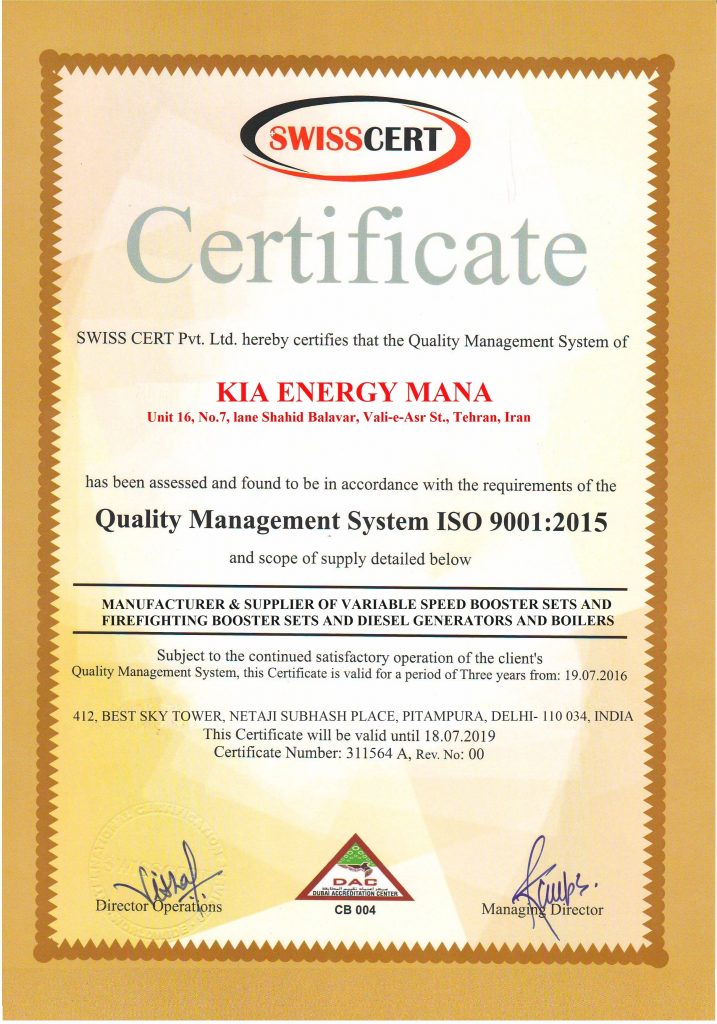 الکتروپمپهای یک بوستر پمپ که به صورت موازی روی یک شاسی اصلی در کنار یکدیگر قرار دارند، مجموعه الکتروپمپ های یک بوسترپمپ را تشکیل می دهند. شرکت کیا انرژی مانا بنا بر درخواست مشتری و پروژه توانایی ارائه بوستر پمپ آبرسانی و آتش نشانی با برندهای معتبر خارجی مختلفی از پمپها از قبیل گراندفوس دانمارک، لوارا ایتالیا، پنتاکس ایتالیا، Saer ایتالیا و لیو چین و برندهای معتبر داخلی از قبیل ابارا، پمپیران، دیزل ساز، سمنان انرژی و ایران تولید و … را دارا میباشد. پیشنهاد کارشناس فنی شرکت کیا انرژی مانا استفاده از پمپ پنتاکس جهت تهیه بوستر پمپ آبرسانی و آتش نشانی به دلیل خدمات پس از فروش و کیفیت مطلوب به نسبت قیمت آن میباشد.