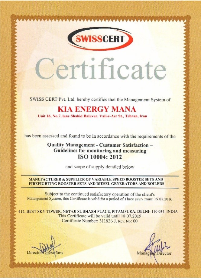 شرکت کیا انرژی مانا با پشتوانه سال­ها تجربه و تلاش و نگاهی علمی و عملی، گواهی­نامه ­های متعددی در زمینه ­های مدیریت، کیفیت و خدمات از جمله گواهی­نامه  ISO 10002، ISO 9001 و گواهی­نامه ISO 10004 را اخذ نموده است.